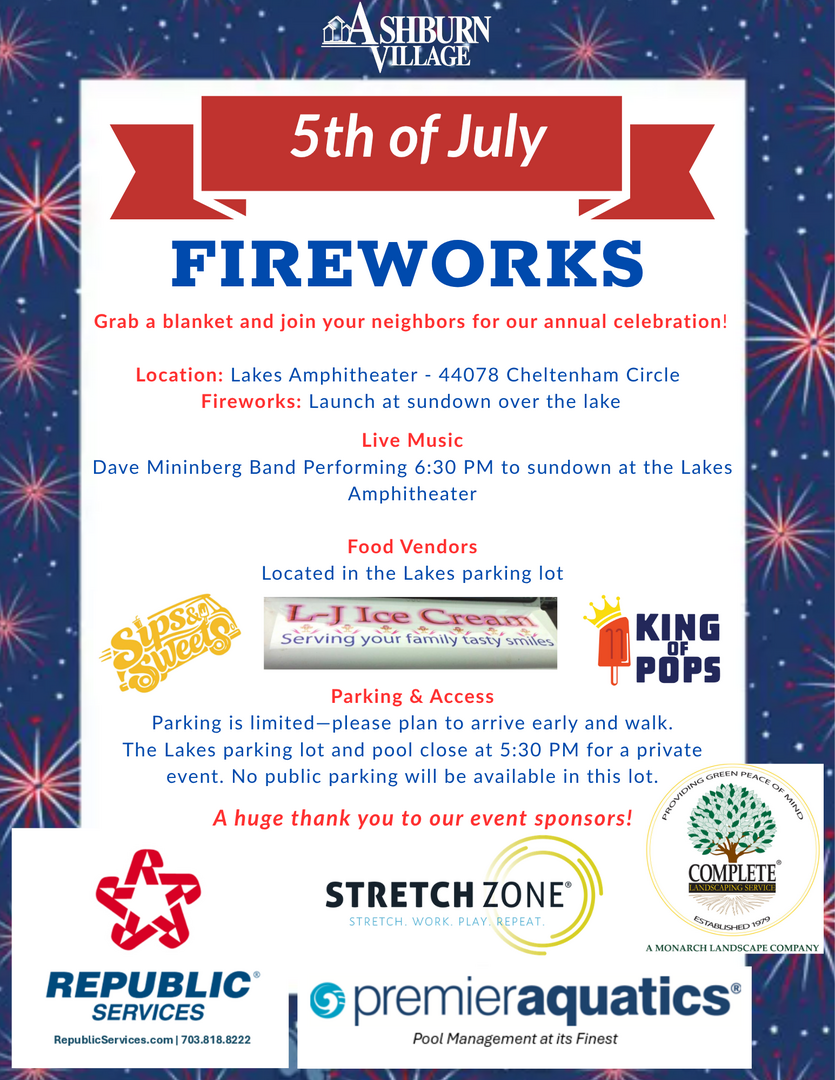 HomeEventsAshburn Village Annual Firework Show Ashburn Village Annual Firework Show Sunday, July 05, 2026 6:00 PM - 10:00 PM 6:00 PM - 10:00 PM See all dates and Times Lakes Amphitheater Parking Deals Get a Ride LYFT UBER Add to Calendar 07/05/2026 06:00 PM 07/05/2026 10:00 PM America/Anguilla Ashburn Village Annual Firework Show Community Firework Show Details & Tickets: https://www.upcomingevents.com/washington-dc/events/lakes-amphitheater/ashburn-village-annual-firework-show-633065?ref=uceaddevent Lakes Amphitheater, 44078 Chelteham Circle , Ashburn, VA, 20147 Set Reminder Categories Festival, Good For Families, Kids & Family, Outdoors & Recreation Community Firework Show