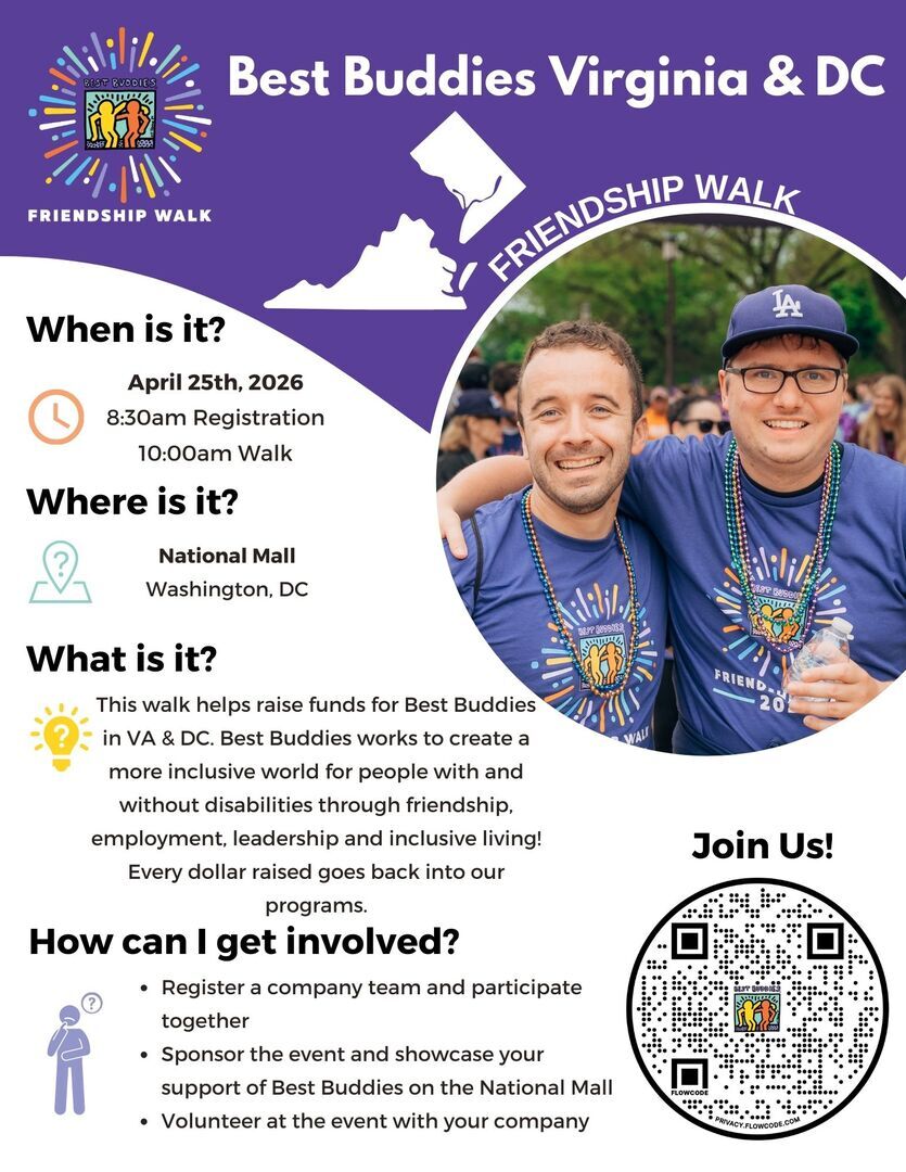 The Best Buddies Friendship Walk in Washington, DC will take place on April 25, 2026, on the iconic National Mall. This free event brings together more than 2,000 participants to celebrate friendship, inclusion, and community while raising awareness and funds for Best Buddies in Virginia & DC.