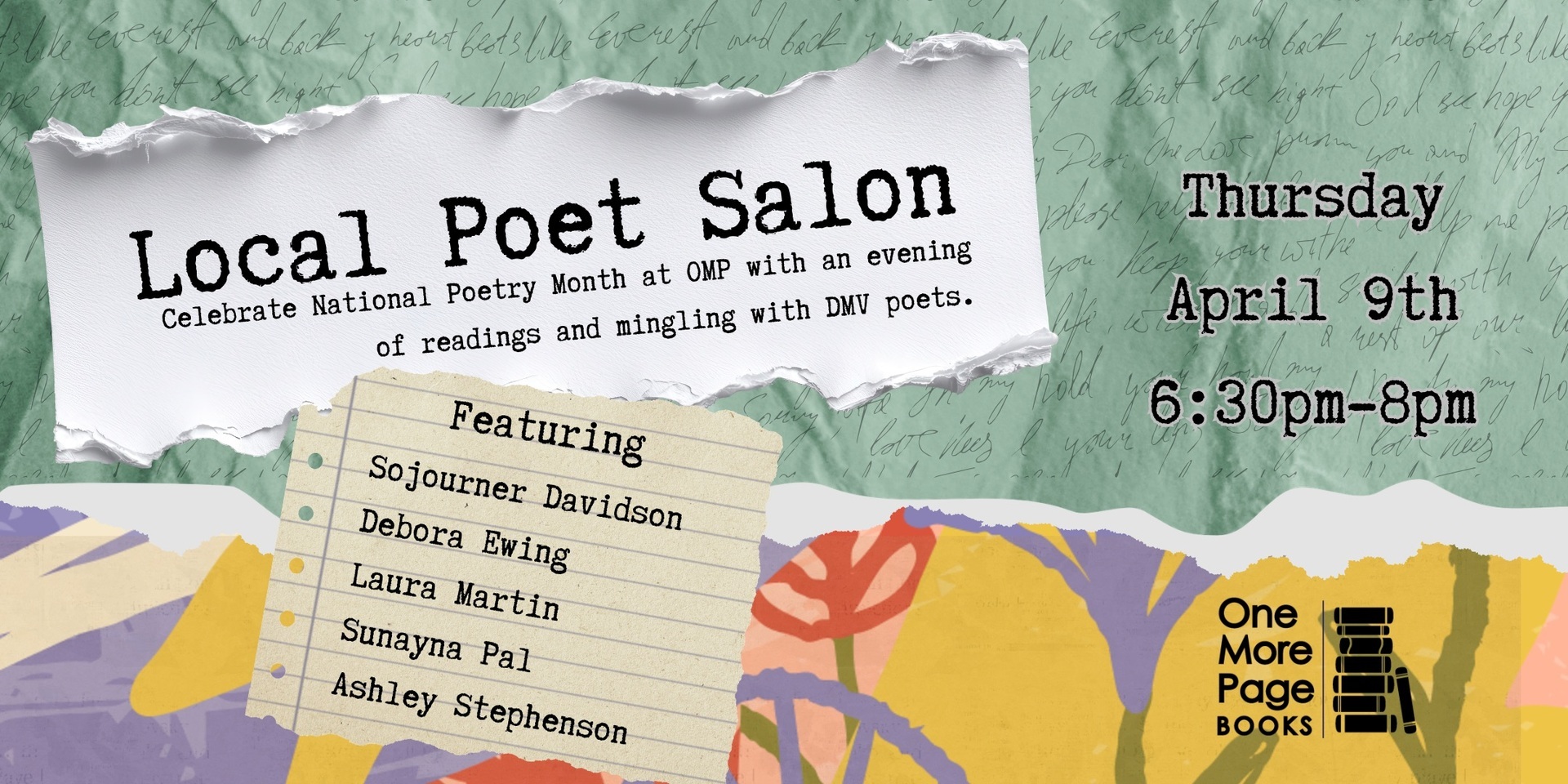 Celebrate National Poetry Month at OMP with an evening full of readings and mingling with local poets! Each poet will do a short reading, followed by time to mingle and book signings.
