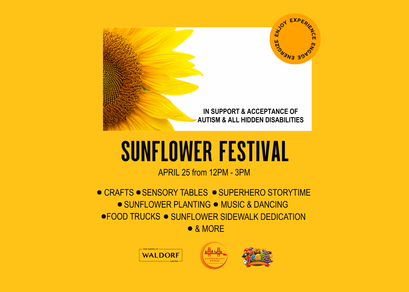 The Shops at Waldorf Center, an open-air lifestyle shopping center located just minutes from the Capital Beltway in Waldorf, Maryland (www.theshopsatwaldorfcenter.com), will host the Sunflower Festival, a family-friendly community event designed to raise awareness of autism and other hidden disabilities. The celebration will feature arts and crafts, sensory tables, story time with a superhero character, sunflower planting, music, dancing, a Sunflower Sidewalk dedication, food trucks, vendors and more. The event will highlight the work of featured charity Accessibility Bridge, a nonprofit that advocates for access and opportunity for individuals with disabilities and their families. The sunflower theme also reflects the internationally recognized Hidden Disabilities Sunflower initiative, a program which helps people with non-visible disabilities discreetly signal that they may need extra time, patience or assistance in public places. The event is free and open to the public; no pre-registration is required to attend. Guests interested in sunflower dedication sponsorships or additional event details may visit https://bit.ly/4sGOAll. To learn more, click here or visit https://theshopsatwaldorfcenter.com/events.