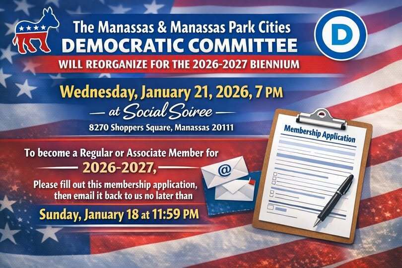 The Manassas and Manassas Park Cities Democratic Committee (MMPCDC) has scheduled a Reorganization Meeting for the evening of Wednesday, January 21, 2026, to elect its members and officers for the 2026-2027 biennium. The mass meeting, also known as an assembled caucus, will be held at The Social Soiree, 8270 Shoppers Square, Manassas, VA 20111 and will formally begin at 7:15 pm.
