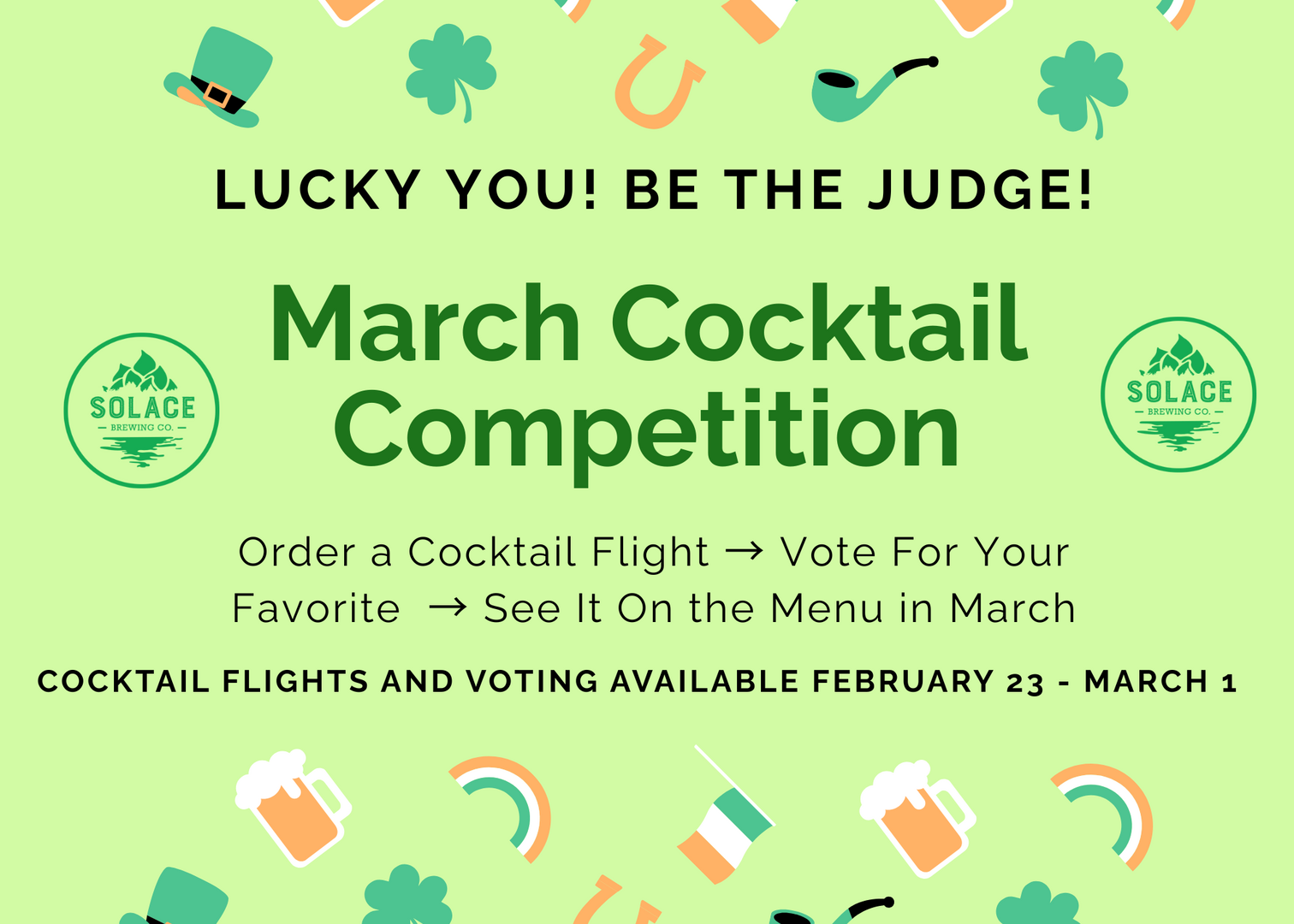 Lucky You! You get to select our March cocktail of the Month! Beginning Monday, February 23, order a flight of our curated and themed cocktails and vote on your favorite!