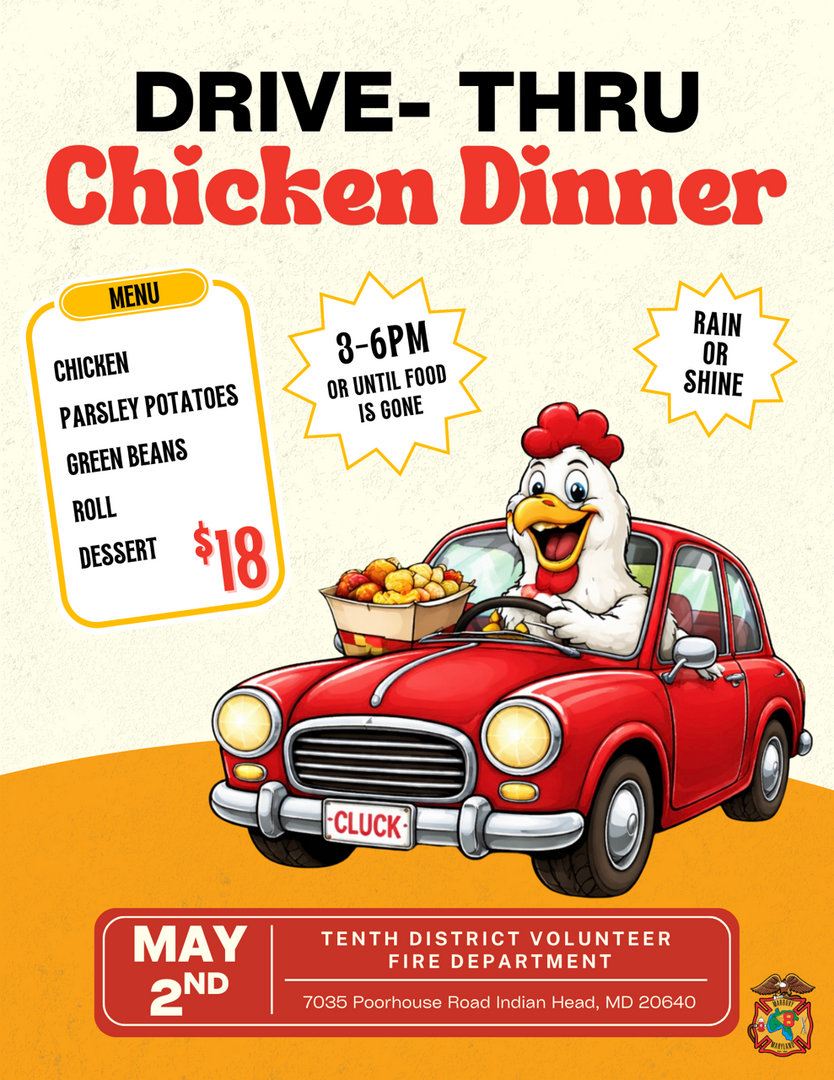 HomeEventsDrive Through Chicken Dinner Drive Through Chicken Dinner Saturday, May 02, 2026 3:00 PM - 6:00 PM 3:00 PM - 6:00 PM See all dates and Times Tenth District Volunteer Fire Department Parking Deals Get a Ride LYFT UBER Add to Calendar 05/02/2026 03:00 PM 05/02/2026 06:00 PM America/Anguilla Drive Through Chicken Dinner Drive Through Chicken Dinner Event (May 2nd) is Rain or Shine 3:00pm to 6:00pm or until sold out Details & Tickets: https://www.upcomingevents.com/washington-dc/events/tenth-district-volunteer-fire-department-/drive-through-chicken-dinner-620566?ref=uceaddevent Tenth District Volunteer Fire Department , 7035 Poorhouse Road, Indian Head, MD, 20640 Set Reminder Categories Benefits Charity, Charities, Fundraising & Charity, Volunteering Drive Through Chicken Dinner Event (May 2nd) is Rain or Shine 3:00pm to 6:00pm or until sold out
