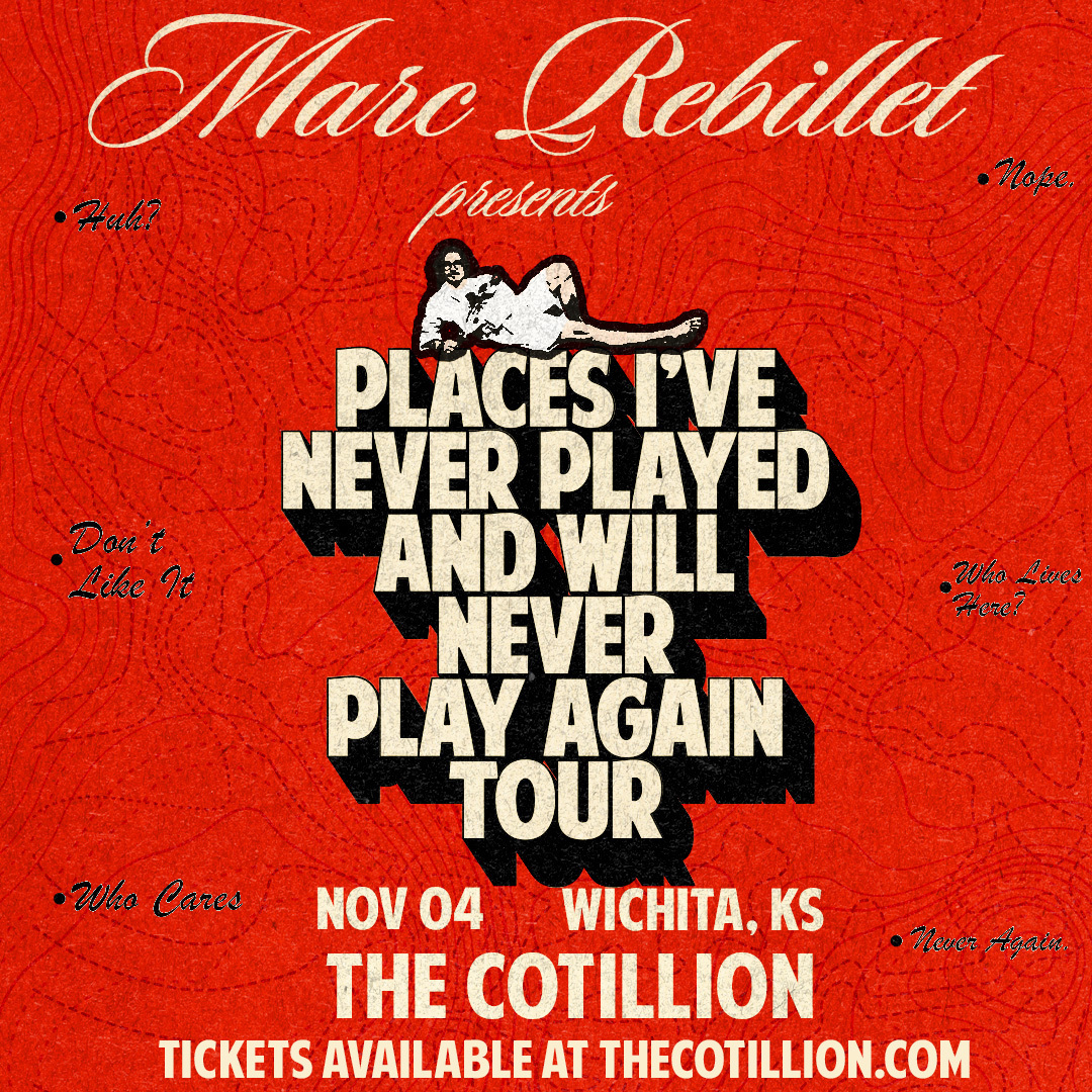 Wear your Cotillion merch and jump to the front of the GA line. A limited number of table reservations are available by calling 316-722-4201 or in person at The Cotillion. Coat check is open during events to check your coats, hats, merch and more. Coat check is located next to merch by the front doors. All sales are final. No exchanges or refunds unless a show is cancelled or postponed.