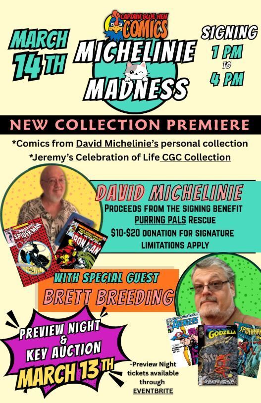 Special Preview of David Michelinie Collection with Auction of Key issues. This is a ticketed event with a portion of the proceeds benefitting cat rescue charity.