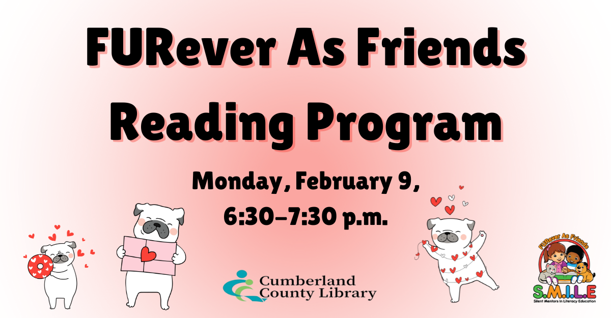 Children and teens of all ages are invited to come read to a fabulous furry friend! FURever as Friends therapy pet teams will be available to help kids practice their reading. Participants can bring a book from home or choose one at the library. Registration is required. For more information, please call 856 453-2210 x.26105 or register online at the following link: https://forms.gle/PpE217dnHo8MTyiZ9