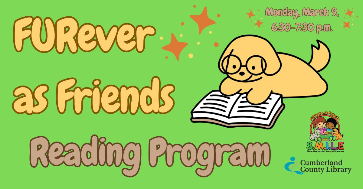 Children and teens of all ages are invited to come read to a fabulous furry friend! FURever as Friends therapy pet teams will be available to help kids practice their reading. Participants can bring a book from home or choose one at the library. Registration is required. For more information, please call 856 453-2210 x.26105 or register online at https://cclnj.org/events