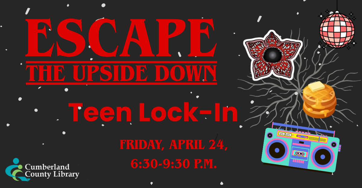 Teens 13-18 are invited to “Escape the Upside Down” in an after-hours event at the Cumberland County Library! Attendees will test their skills while participating in “strange” challenges based on a popular TV series set in the 1980s. Pizza will be provided and teens can make their own dessert at our waffle bar. Registration is required for this program, as is a permission slip signed by the teen’s parent or guardian. Permission slips are available in the Youth Services Department or online when registering. Anyone not registered for the event will not be able to attend. The library will be closed to the public during this event.