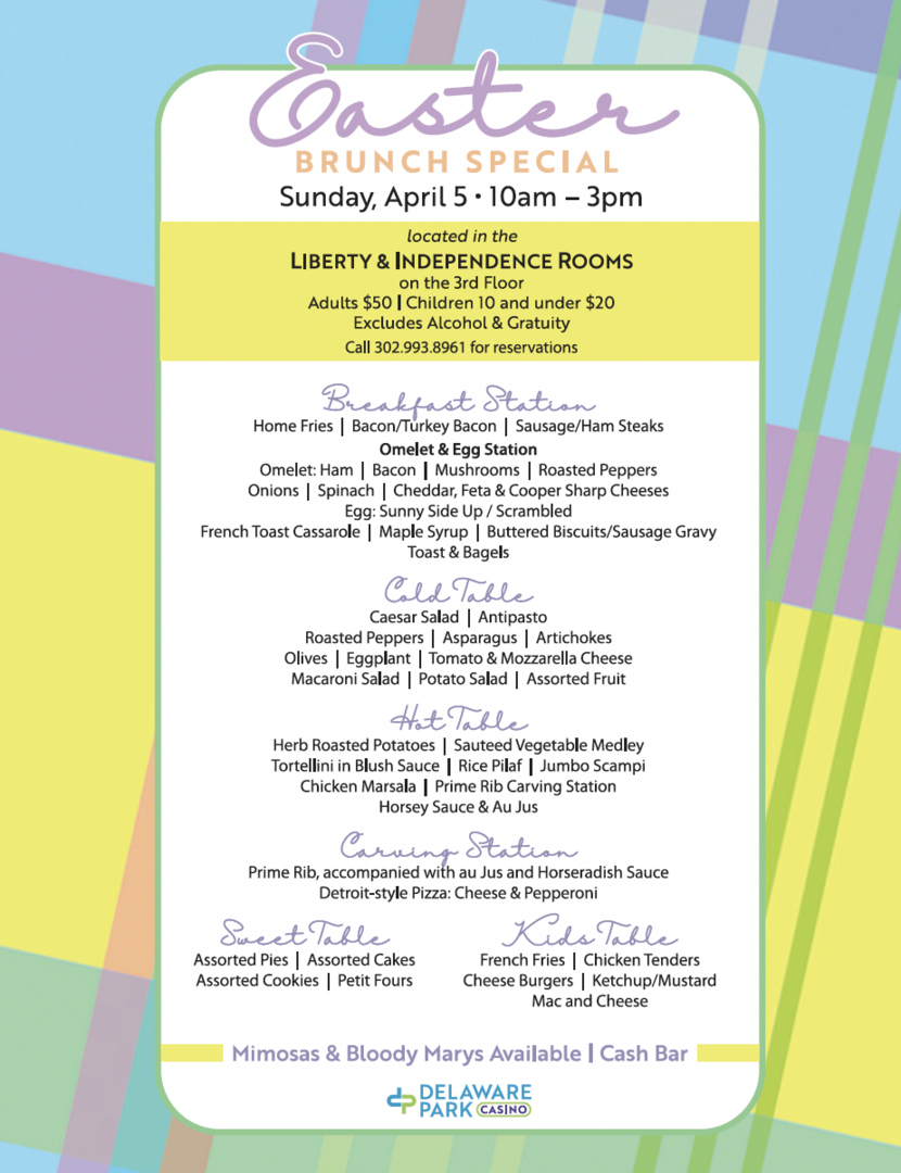 On Sunday, April 5, gather your family and friends for a delicious, buffet-style brunch at Delaware Park Casino from 10 a.m. to 3 p.m. Treat yourself to a spread of seasonal favorites, including a made-to-order omelet station, a prime rib carving station, delicious entrees and desserts, and more!