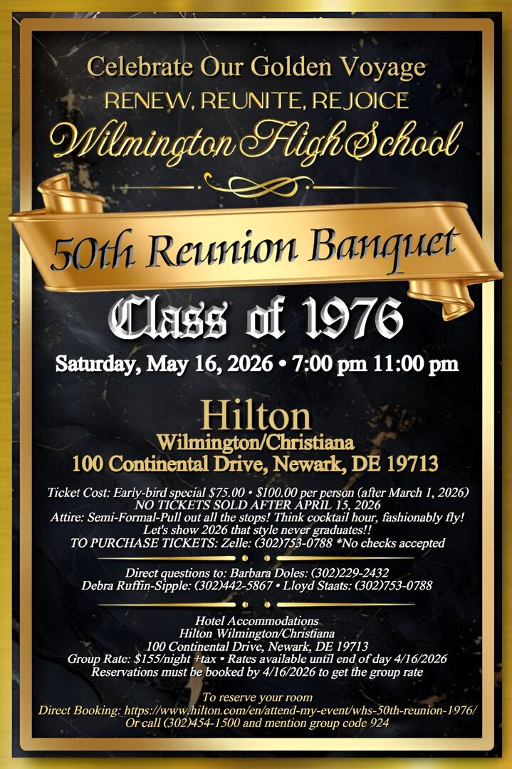 Ticket Cost: Early-bird special $75 until March 1, 2026. After March 1, 2026, ticket price is $100 includes dinner and dancing with DJ FORMULA. NO TICKETS WILL BE SOLD AFTER APRIL 13, 2026. Attire: Semi-formal! Pull out all the stops! Think cocktail hour, fashionably fly! TO PURCHASE TICKETS: ZELLE (302)753-0788. DIRECT QUESTIONS TO: Barbara Doles: 302-229-2432, Debra Ruffin-Sipple: 302-442-5867 or Lloyd Staats: 302-753-0788 HOTEL ACCOMMODATIONS: Hilton Wilmington/Christiana, 100 Continental Drive, Newark, DE 19713. Group Rate: $155/night plus tax - This rate is available until end of day April 16, 2026. Hotel website: https://www.hilton.com/en/attend-my-event/whs-50th-reunion-1976 or Call: 302-454-1500 and mention GROUP CODE 924. We are also planning for a Friday night social. More information to come!
