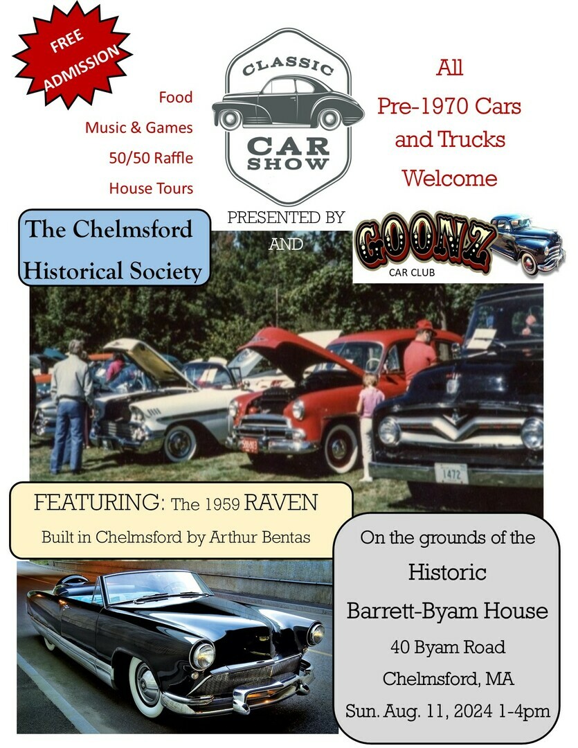 The Chelmsford Historical Society, in collaboration with Goonz Car Club Massachusetts, will be holding a classic car show on Sunday, August 11, 2024 from 1-4pm.