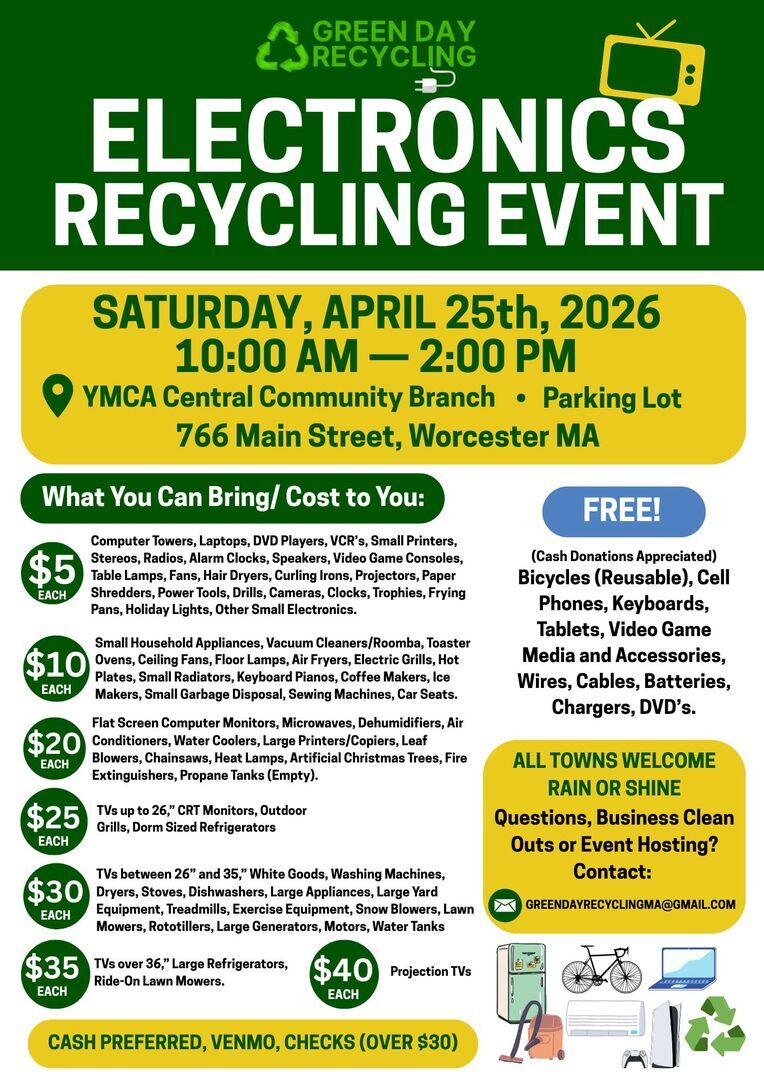 Residents from all towns and communities are welcome to recycle. The event will be rain or shine. Computer hard drives will be destroyed during the recycling process, but can be removed on-site at the event for an additional charge. Cash payment is preferred, but checks will be an acceptable form of payments over $30.