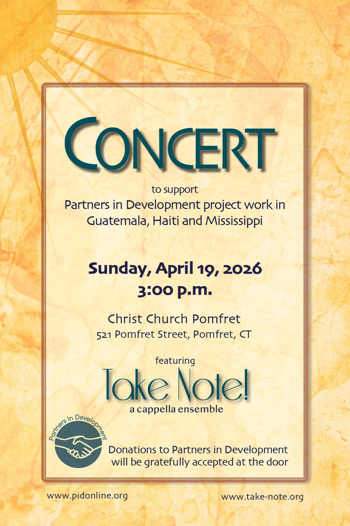 POMFRET - The acclaimed a cappella ensemble Take Note! will perform in a benefit concert on Sunday, April 19, 2026, at 3:00 p.m., hosted by Christ Church Pomfret, 521 Pomfret Street, Pomfret, CT. Donations received at the door will support Partners in Development (PID) and its project work in Guatemala, Haiti, and Mississippi.