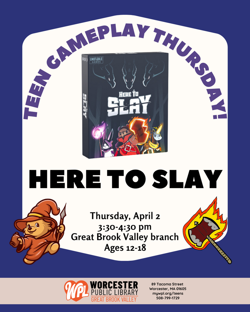 HomeEventsHere to Slay Here to Slay Thursday, April 02, 2026 3:30 PM - 4:30 PM 3:30 PM - 4:30 PM See all dates and Times Great Brook Valley Branch Library Parking Deals Get a Ride LYFT UBER Add to Calendar 04/02/2026 03:30 PM 04/02/2026 04:30 PM America/Anguilla Here to Slay Teens can stop by our Great Brook Valley branch to play the card game Here to Slay (with expansion packs)! Ages 12-18.Event LinksWebsite: https://go.evvnt.com/3507361-0 Details & Tickets: https://www.upcomingevents.com/worcester/events/great-brook-valley-branch-library/here-to-slay-610822?ref=uceaddevent Great Brook Valley Branch Library, 89 Tacoma Street, Worcester, MA, 01605 Set Reminder Categories Education, Educational, Literary & Books View Event Website » Teens can stop by our Great Brook Valley branch to play the card game Here to Slay (with expansion packs)! Ages 12-18.Event LinksWebsite: https://go.evvnt.com/3507361-0 Read More View Less