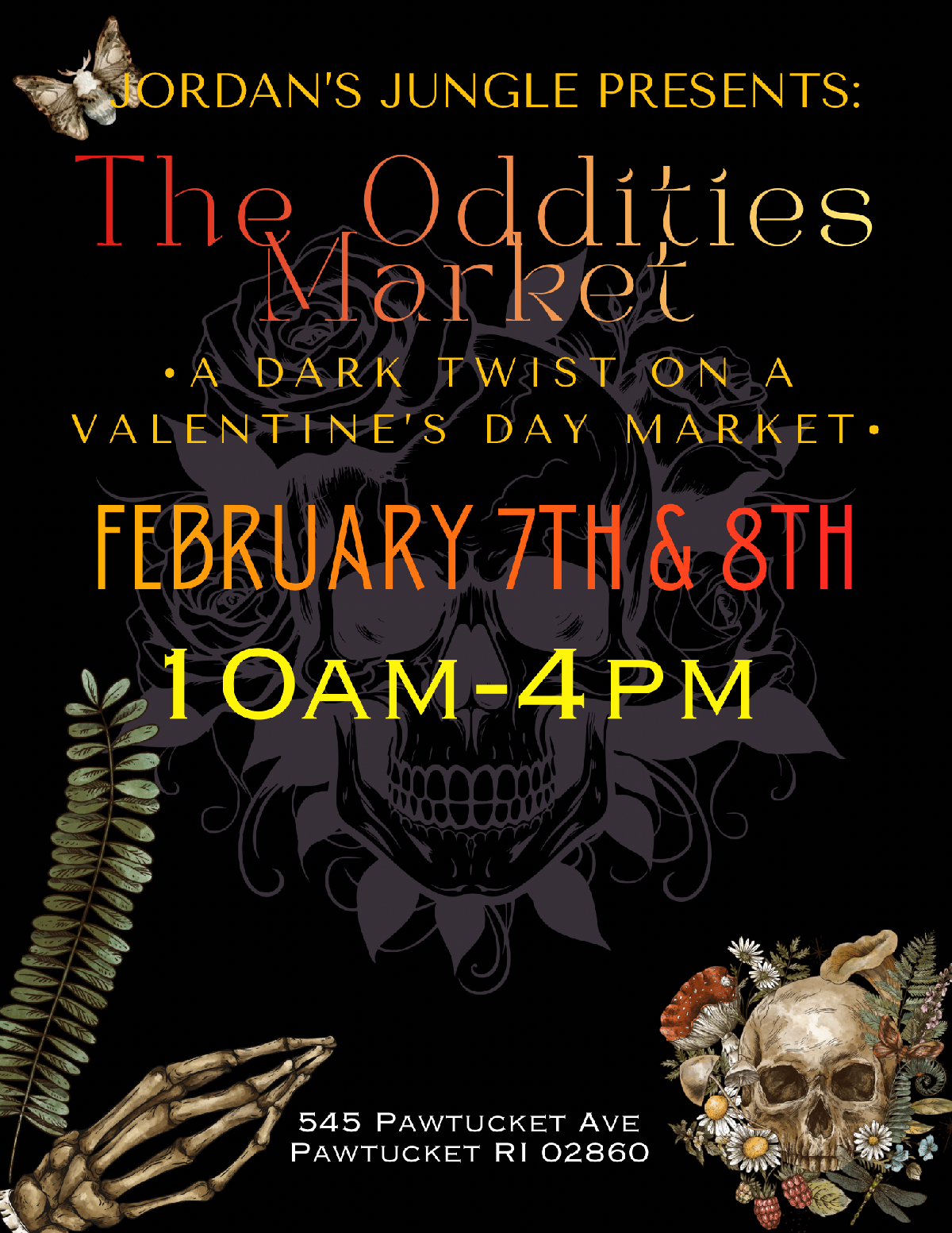 HomeEventsThe Oddities Market 26' The Oddities Market 26' Saturday, February 07, 2026 10:00 AM - 4:00 AM 10:00 AM - 4:00 AM See all dates and Times Jordan's Jungle Parking Deals Get a Ride LYFT UBER Facebook Event Add to Calendar 02/07/2026 10:00 AM 02/08/2026 04:00 AM America/Atikokan The Oddities Market 26' Details & Tickets: https://www.upcomingevents.com/providence/events/jordans-jungle/the-oddities-market-26-595069?ref=uceaddevent Jordan's Jungle, 545 Pawtucket Ave, Pawtucket, RI, 02860 Set Reminder Event Tag Free / No Charge, Shopping Categories Other & Miscellaneous, Sales & Retail View Event Website »