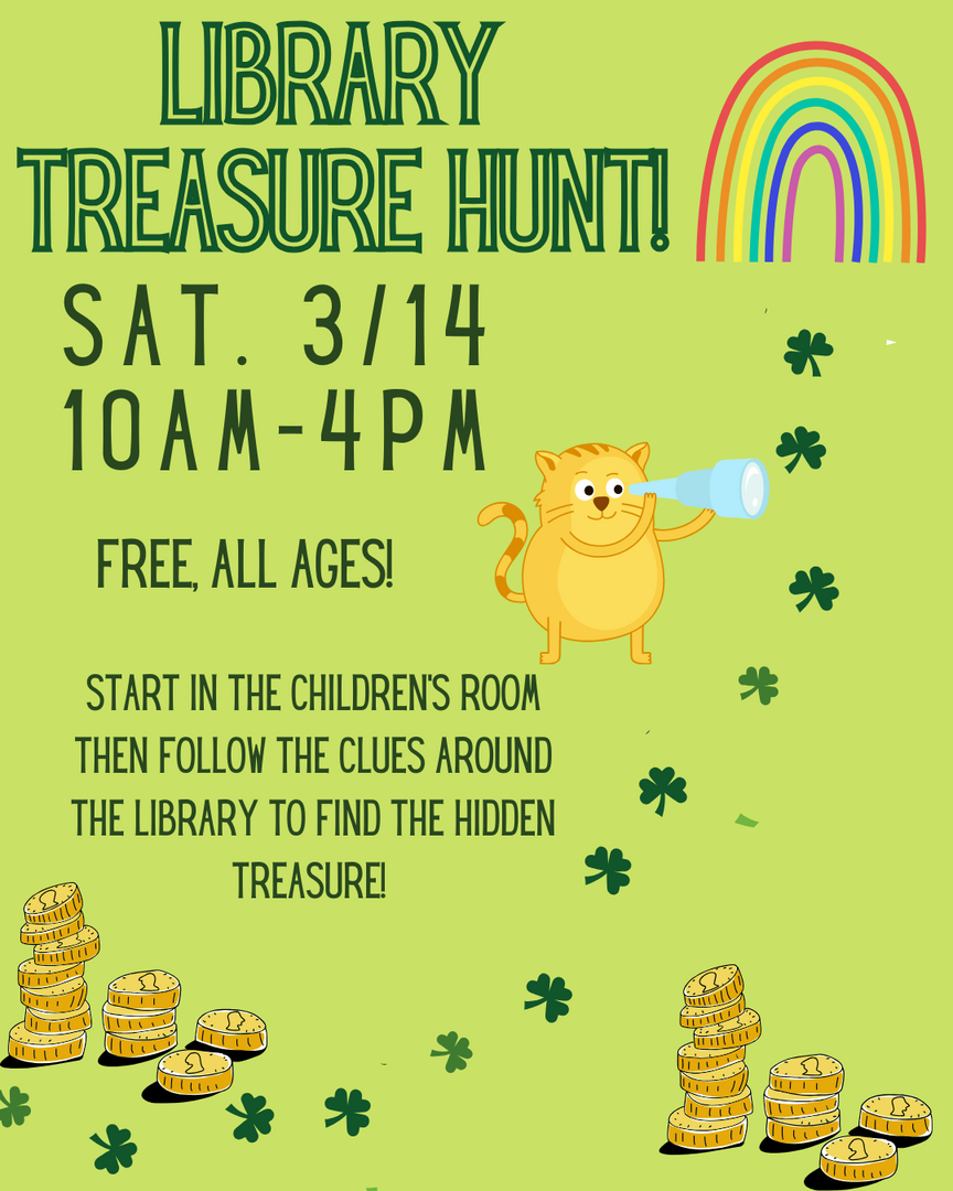 The scavenger hunt leaves the Children's Room, follow the clues across the building to find the hidden treasure! All ages welcome, drop-in anytime to participate.