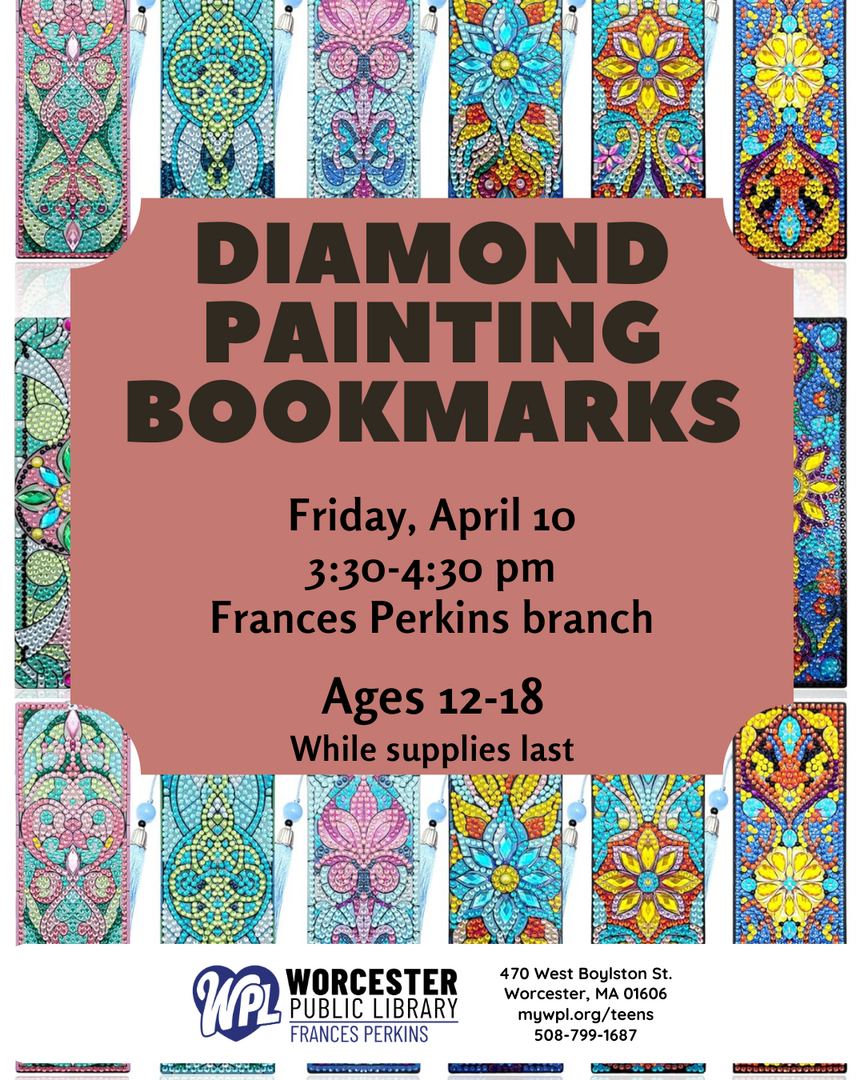 HomeEventsDiamond Painting Bookmarks Diamond Painting Bookmarks Friday, April 10, 2026 3:30 PM - 4:30 PM 3:30 PM - 4:30 PM See all dates and Times Worcester Public Library Frances Perkins Branch Parking Deals Get a Ride LYFT UBER Add to Calendar 04/10/2026 03:30 PM 04/10/2026 04:30 PM America/Anguilla Diamond Painting Bookmarks Ages 12-18.Event LinksWebsite: https://go.evvnt.com/3507369-0 Details & Tickets: https://www.upcomingevents.com/worcester/events/worcester-public-library-frances-perkins-branch/diamond-painting-bookmarks-610827?ref=uceaddevent Worcester Public Library Frances Perkins Branch, 470 West Boylston Street, Worcester, MA, 01606 Set Reminder Categories Education, Educational, Literary & Books View Event Website » Ages 12-18.Event LinksWebsite: https://go.evvnt.com/3507369-0