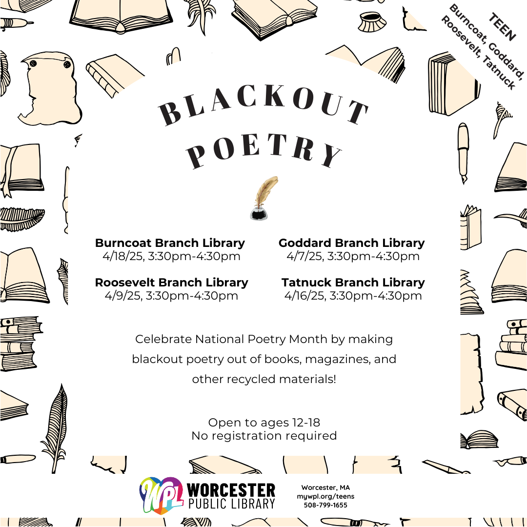HomeEventsBlackout Poetry This Event has Passed Blackout Poetry Wednesday, April 09, 2025 3:30 PM - 4:30 PM 3:30 PM - 4:30 PM See all dates and Times Worcester Public Library Roosevelt Branch Parking Deals Get a Ride LYFT UBER Add to Calendar 04/09/2025 03:30 PM 04/09/2025 04:30 PM America/Atikokan Blackout Poetry Ages 12-18 are invited to Roosevelt Branch Library to celebrate National Poetry Month by making blackout poetry out of books, magazines, and other recycled materials! No registration required. Details & Tickets: https://www.upcomingevents.com/worcester/events/worcester-public-library-roosevelt-branch/blackout-poetry-400712?ref=uceaddevent Worcester Public Library Roosevelt Branch, 1006 Grafton Street, Worcester, MA, 01604 Set Reminder Categories Education, Educational, Literary & Books Ages 12-18 are invited to Roosevelt Branch Library to celebrate National Poetry Month by making blackout poetry out of books, magazines, and other recycled materials! No registration required.