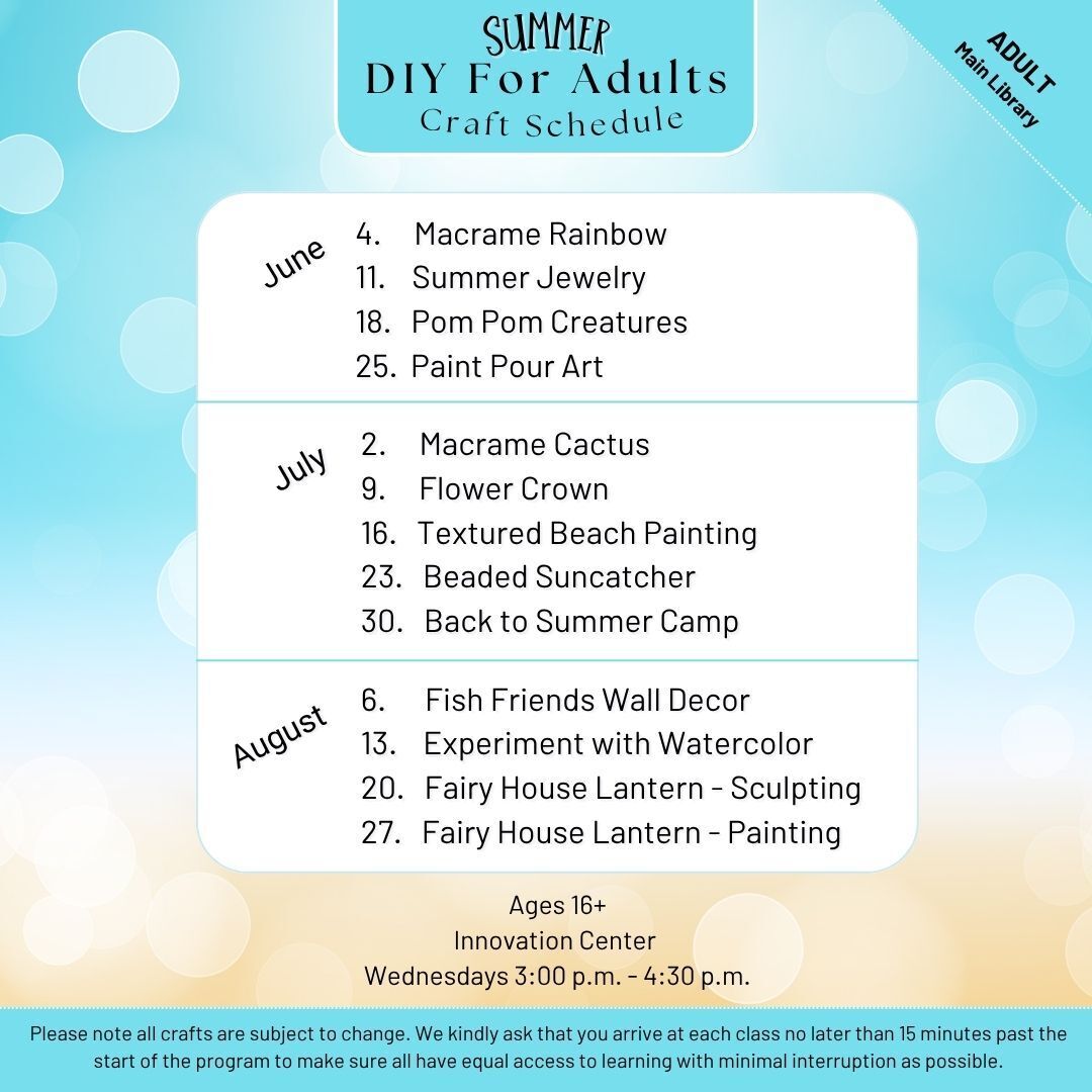 Projects may include Macrame Rainbows, Textured Beach Paintings, Fairyhouse Lanterns, & more! This program takes place in the Innovation Center for ages 16 and up. No registration required.